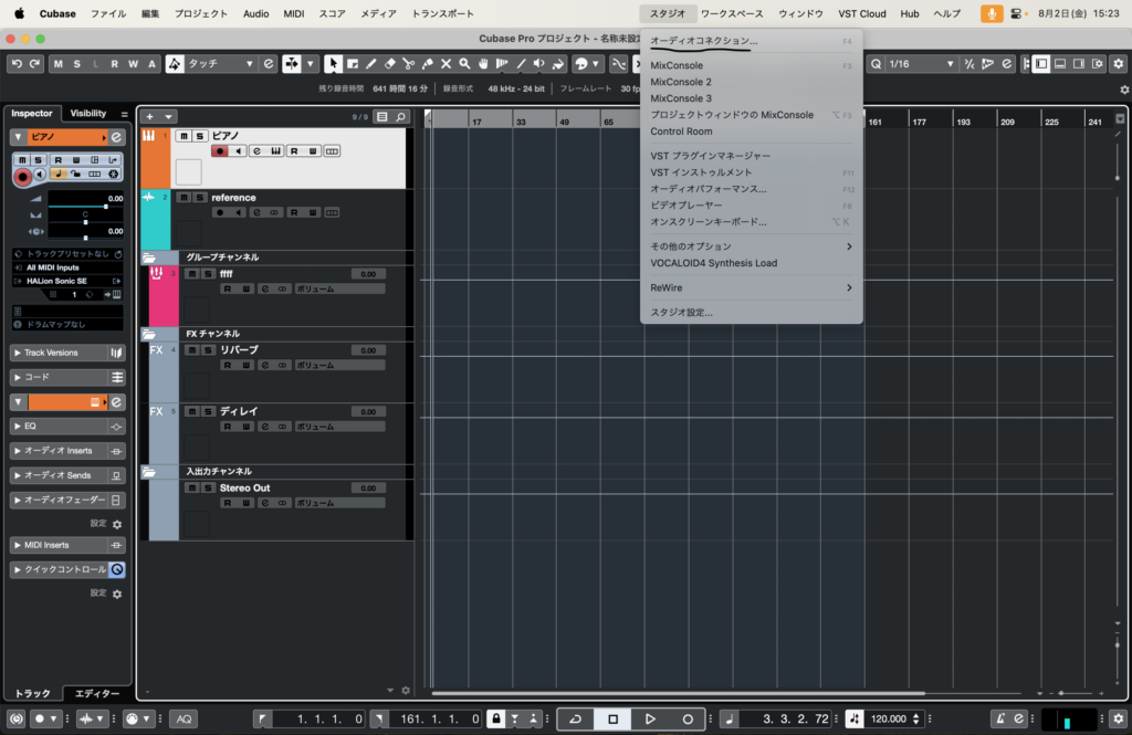 次に、スタジオ設定を終了し、スタジオ→オーディオコネクションをクリックします。