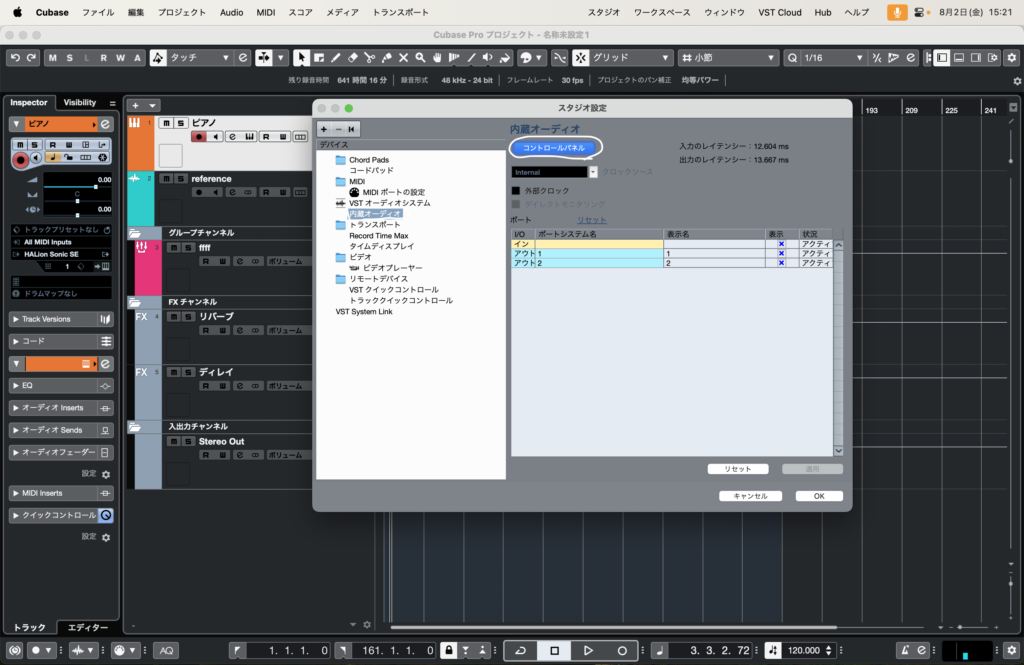 ASIOドライバーの横でドライバーの設定が可能です。内蔵オーディオやオーディオインターフェースなど使いたいオーディオを選択してください。