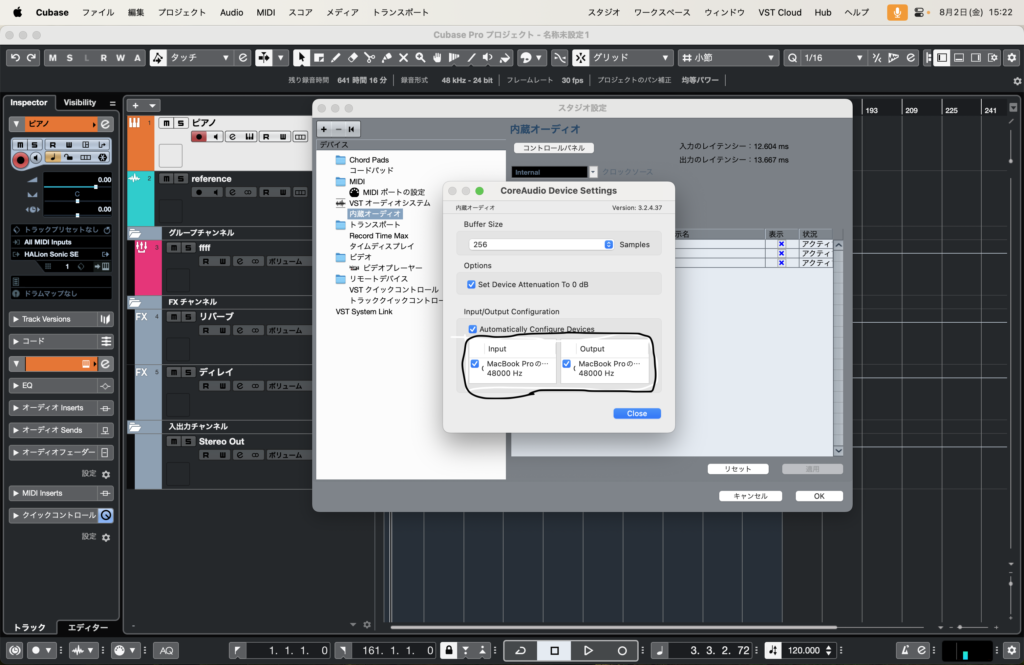 オーディオデバイスで内蔵オーディオやオーディオインターフェースなど使用したいオーディオを選びます。