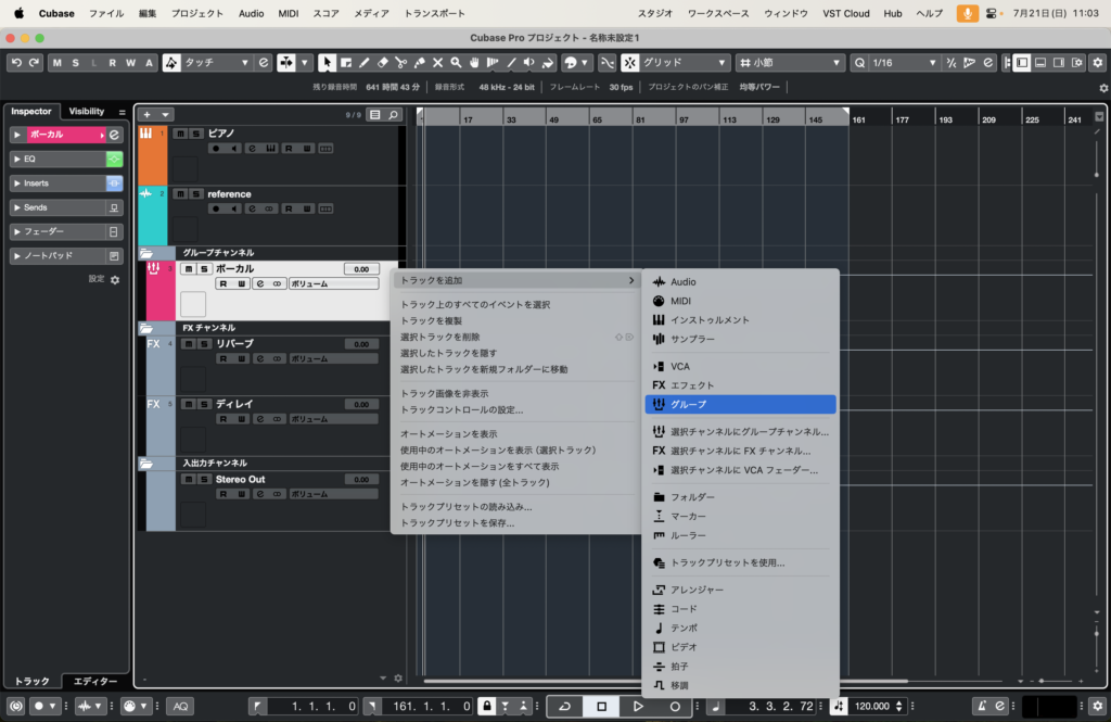 インストゥルメント、オーディオ、グループ、FXのトラックをそれぞれ用意