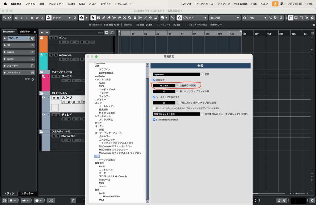 これをすることで、Cubaseが突然終了した場合でもバックアップされます。
