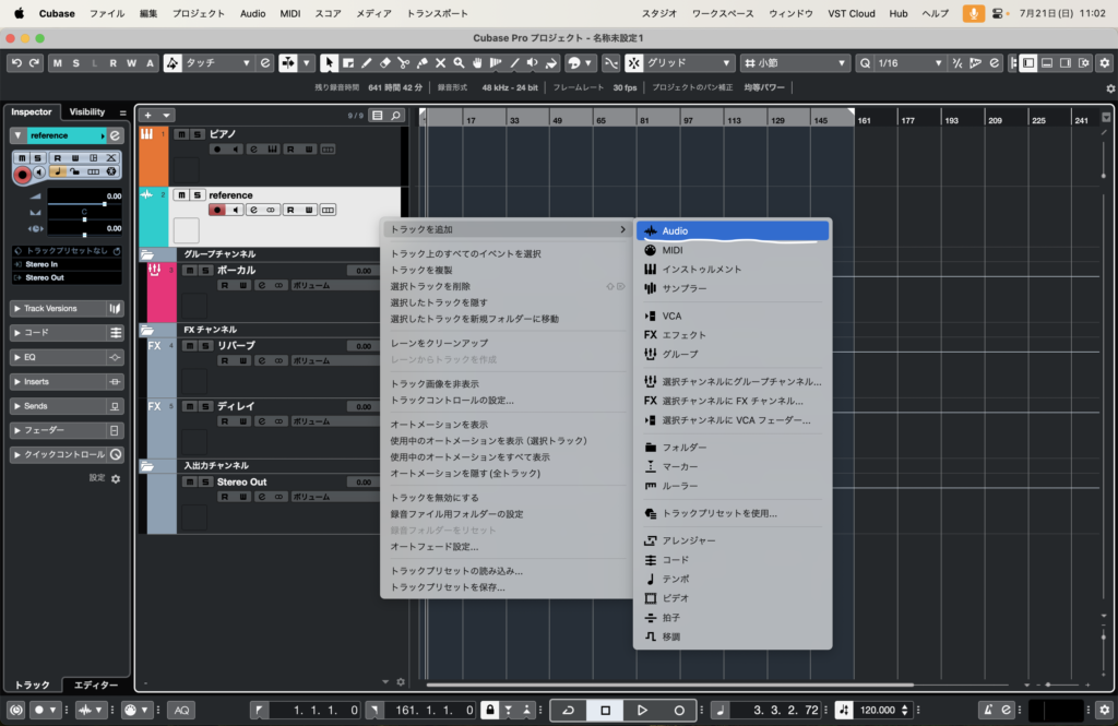 DTMで参考にしたい曲を貼り付けられるようにオーディオトラックを用意します。