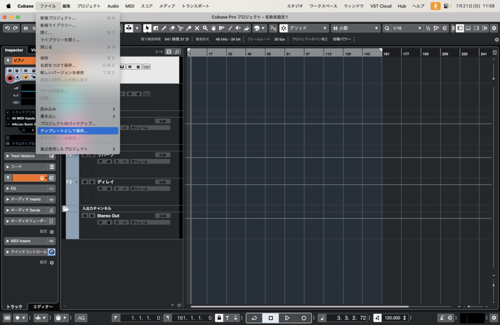 Cubaseをクリック→テンプレートとして保存をクリックし、テンプレートを保存しましょう。