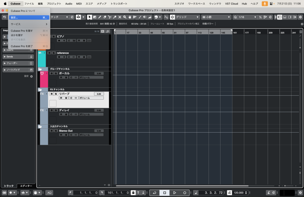 まず初めに、Cubaseをクリック→設定をクリックしましょう。