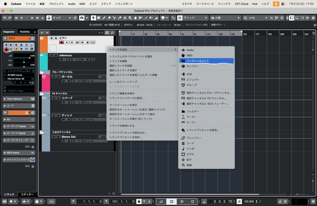 右クリック→トラックを追加→インストゥルメントの順でトラックを追加してください。