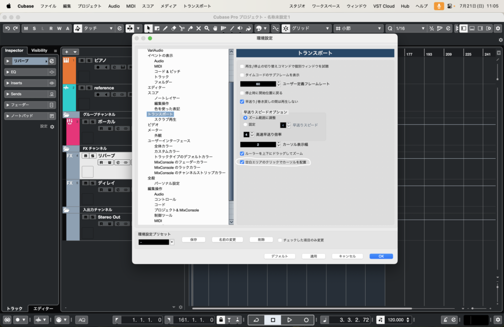 トランスポートをクリック→「空白のエリアのクリックでカーソルを配置」にチェックを入れましょう。