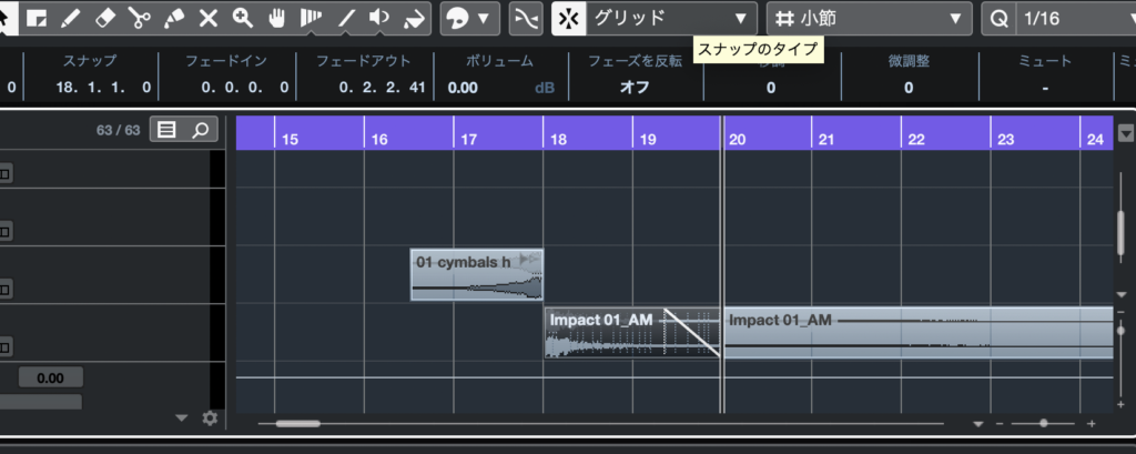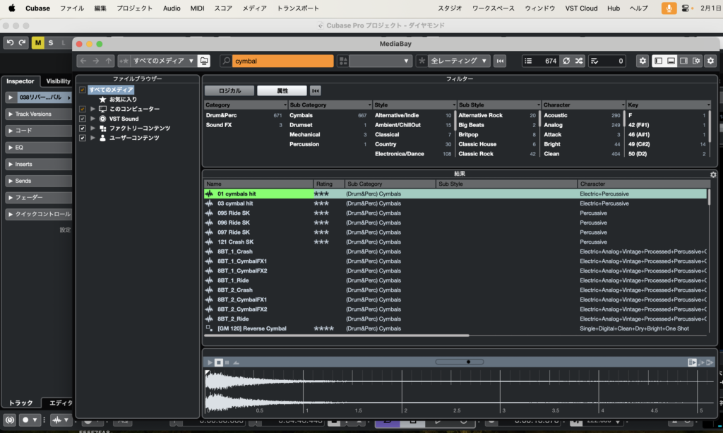 Cubaseの場合はMediaBayからシンバルのオーディオデータを探してください。