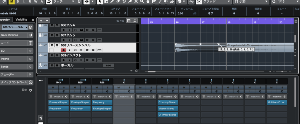 ③リバースさせます。CubaseであればAudio→処理→リバースを選択してください。