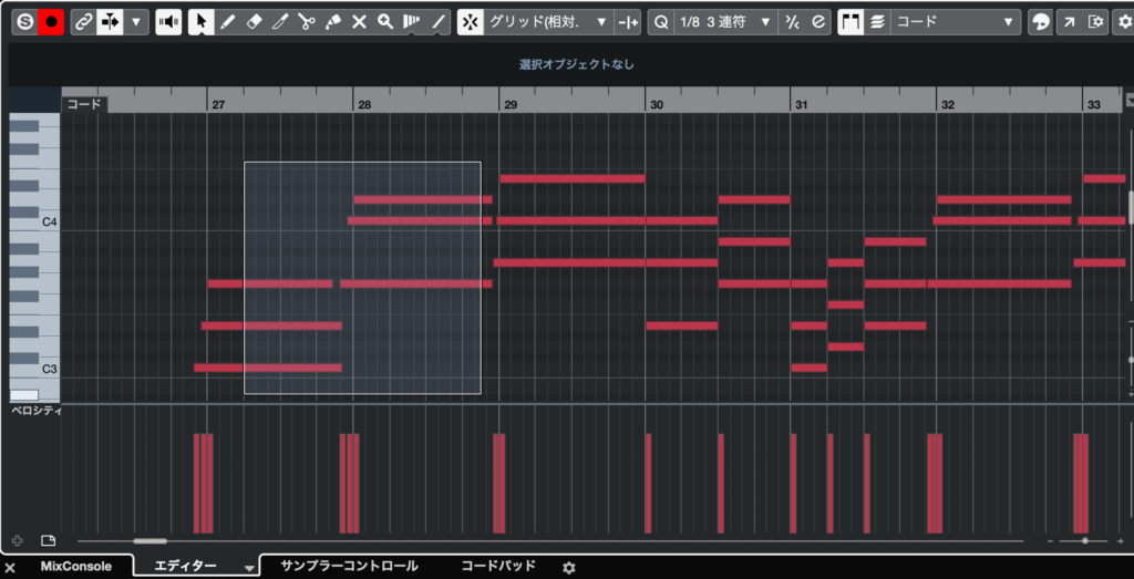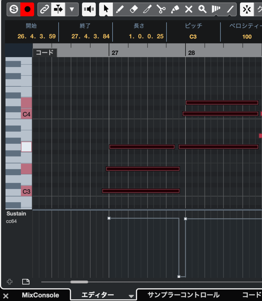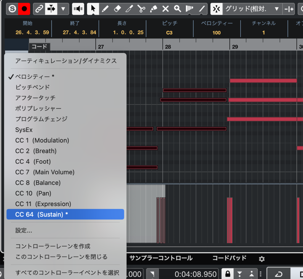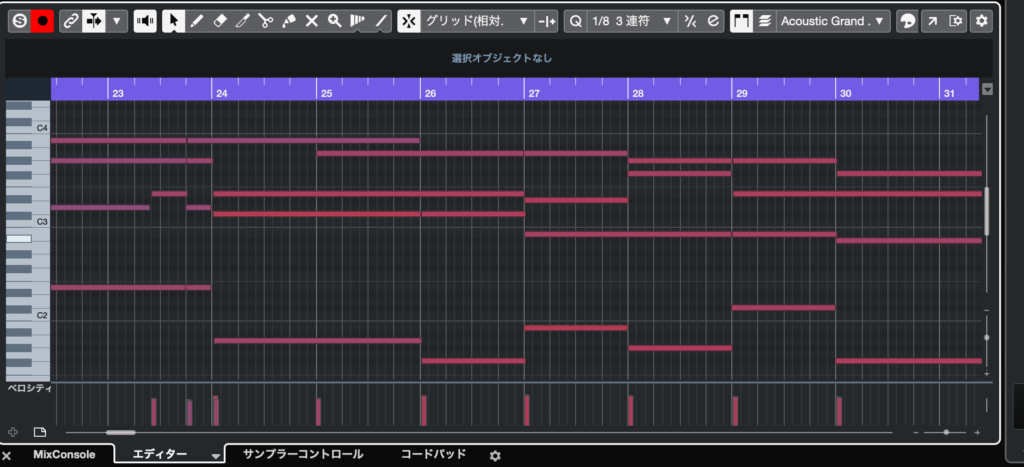 ピアノを打ち込んだら、ベロシティを変える、タイミングをずらす、動きをつけるをやってみましょう。サスティンペダルも動かすべきです。