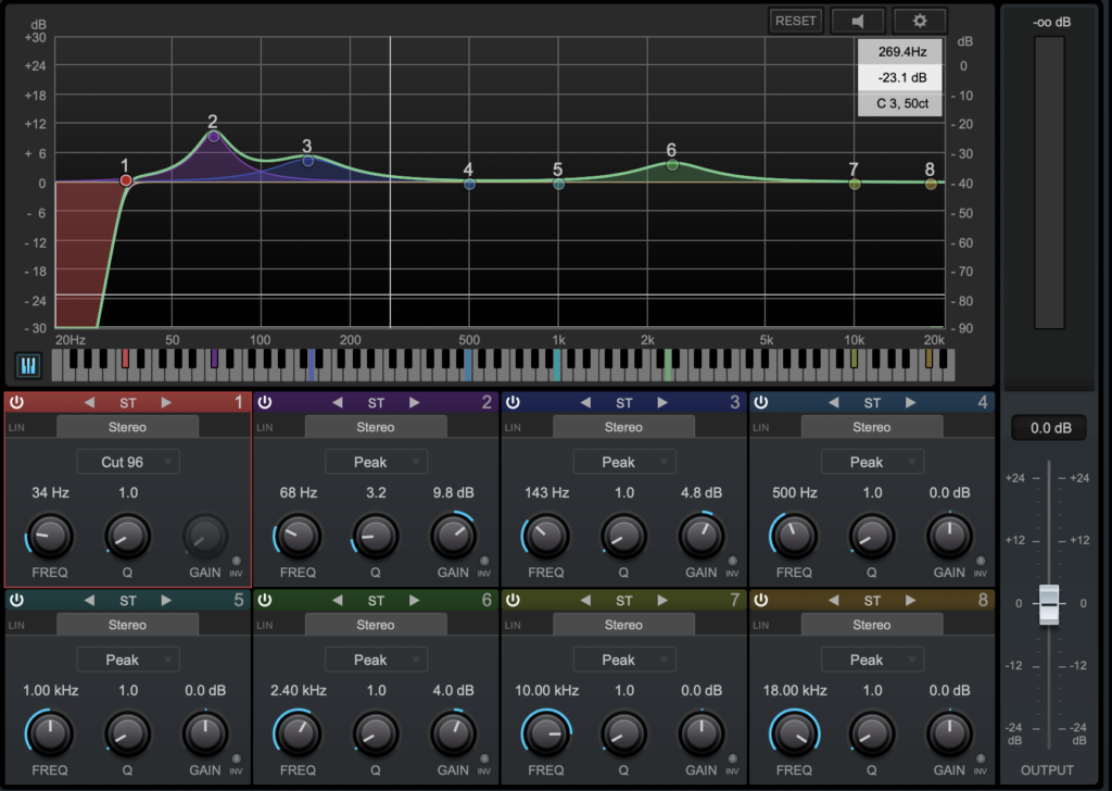ピアノのEQは、高音と低音を上げて、中音を削るやり方をおすすめします。