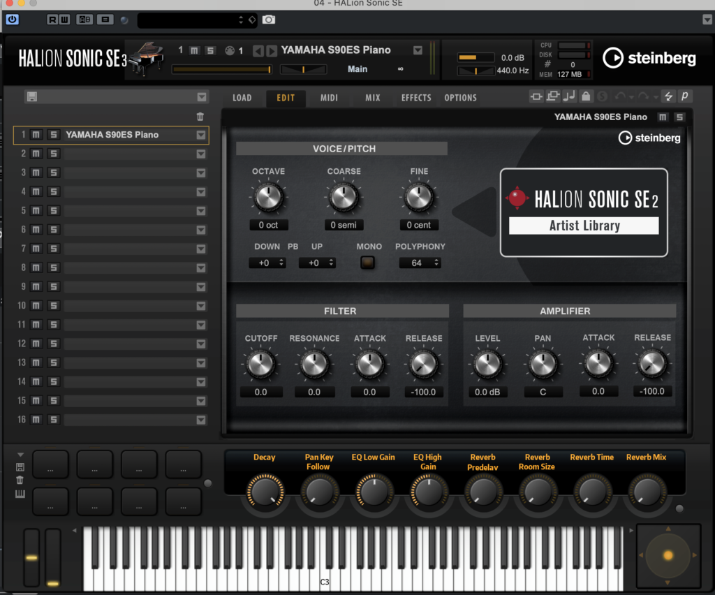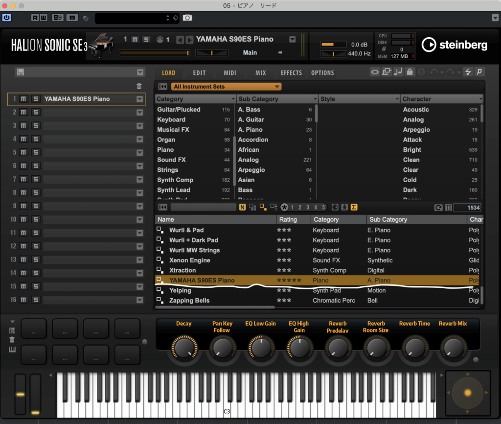 HALion Sonic SEを開き、YAMAHA S90ES Pianoを選びます。